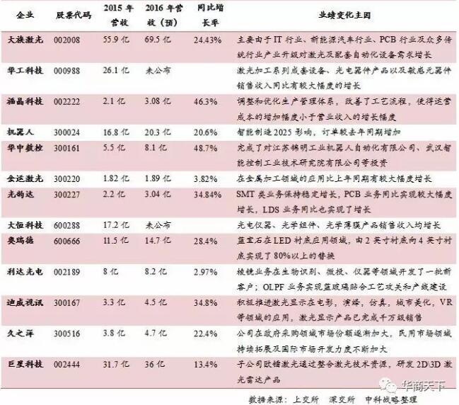 根據2016年相關數據,國內已上市激光企業營收規模超30億元的,有大族激光、巨星科技及華工科技三家。除大族激光收入接近70億元,巨星科技年營收約在36億左右,華工科技年營收則在33億左右。(數據根據2016各公司財報)