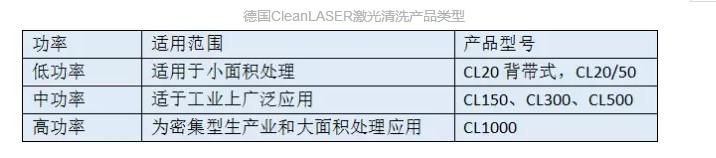 德國CleanLASER推出了多種型號的產品,涵蓋低功率到高功率,可清洗油漆、鐵鏽、灰塵、油汙、指紋等。近年來CleanLASER致力於研究可以實現塑膠射出模和橡膠硫化模具線上、高溫清洗垢激光清洗設備。