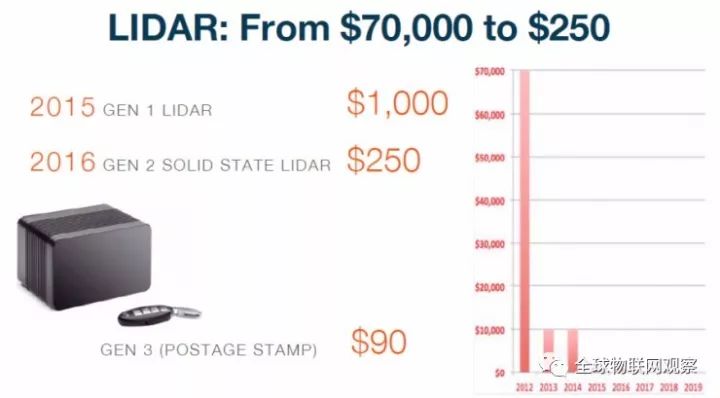 2016年初的美國CES上,激光雷達初創公司 Quanergy 展示了號稱是全球第一款固態激光雷達傳(chuan) 感器,並稱如果訂貨量在一萬(wan) 台,每台激光雷達的成本有望控製在 100 美元以下。