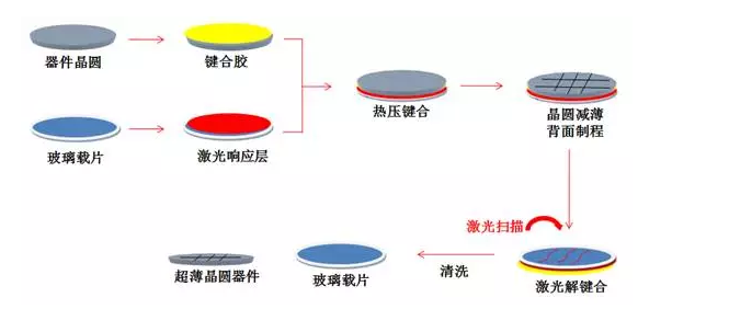 激光拆鍵合技術是將臨(lin) 時鍵合膠通過旋塗的方式塗在器件晶圓上,經過烘烤和高溫加壓下將超薄器件臨(lin) 時粘結到較厚的載片上;臨(lin) 時鍵合後,對其進行背麵加工(包括減薄、TSV加工和金屬化等後續製程),再通過激光掃描的方式,分離超薄器件與(yu) 載片,實現超薄器件的順利加工。最後,再執行清洗工藝。