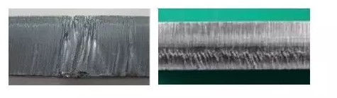 2. 切割麵品質問題 圖1.和圖2.示出了加工中厚板時經常會(hui) 遇見的切割斷麵,這樣的切割不僅(jin) 成品質量受到質疑,還會(hui) 伴隨著過燒和嚴(yan) 重的粘渣出現,以致體(ti) 現不出高價(jia) 的激光加工機區別於(yu) 其他切割手段的價(jia) 值。