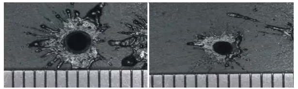 高峰穿孔(HPP)方案 顧名思義(yi) 就是利用占空比小的高峰值脈衝(chong) 激光,輔以噴射在材料表麵上的不燃油以清除開孔邊緣附著物,控製脈衝(chong) 的合理頻率邊冷卻邊穿孔。其特點是相對炸孔雖然 時間稍長(3秒),但穿出的孔徑小(約φ4mm)且開孔邊緣無附著物以及入熱較低,便於(yu) 接下來的正常切割加工,相比普通穿孔則效率提高了4倍。圖3.示出 了普通穿孔、HPP穿孔和高能穿孔的區別。