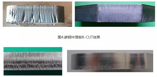 2. 切割斷麵改善方案 對於(yu) 碳鋼來說改善切割斷麵的重要因素是控製對板材的入熱並能保證激光照射部分的充分燃燒。三菱電機開發的K-CUT加工條件較好的完成了這一使命。圖4. 是在同一塊國產(chan) 板材上用傳(chuan) 統條件和K-CUT條件進行切割的效果比較。而對於(yu) 不鏽鋼來說改善切割斷麵的重要因素則是光束的改良(改善焦深)與(yu) 輔助氣體(ti) 的有 效利用。亮麵切割技術就是改善了發振器和噴嘴所得到的結果。圖5.是改善後的效果。斷麵上部粗糙度8μ、下部12μ堪比機械加工。