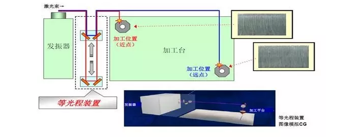 3. 保證加工穩定性的方案 當前為(wei) 了提高加工機的運行速度,激光機多采用俗稱飛行光路的結構,即材料托盤不動而加工頭在整個(ge) 可加工區域內(nei) 運動的形式。而為(wei) 了補償(chang) 加工頭與(yu) 光源相對位置 的變化,各廠商也盡可能保證光斑在加工範圍內(nei) 的一致性,使用曲率可變折射鏡是普遍選擇的方式。這種方法雖然結構簡單卻會(hui) 改變焦深,使在對焦深極為(wei) 敏感的中 厚板切割時會(hui) 顯得力不從(cong) 心(既要保持光斑不變又要保持焦深不變)。三菱電機采用的等長光路方式(在可加工範圍內(nei) 光源與(yu) 加工頭之間光傳(chuan) 播路徑等長)可避免焦 深變化,從(cong) 而使光斑和焦深都保持一致。另外對入熱的重視使板材積累的熱量得到控製,較好地解決(jue) 了穩定性問題。圖6.示出了等長光路的原理及在加工區域中不 同位置的加工效果。