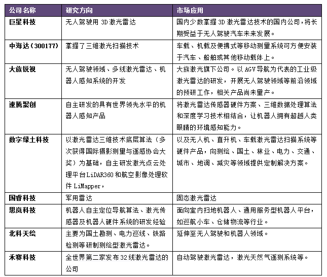 激光雷達技術有著這麽(me) 廣闊的應用市場,致使國內(nei) 眾(zhong) 多企業(ye) 紛紛涉足其中。國內(nei) 主要激光雷達廠商(如下表格)。