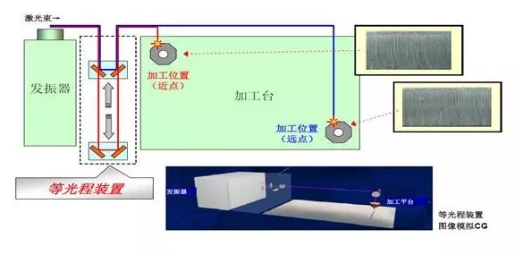 3. 保證加工穩定性的方案 當前為(wei) 了提高加工機的運行速度,激光機多采用俗稱飛行光路的結構,即材料托盤不動而加工頭在整個(ge) 可加工區域內(nei) 運動的形式。而為(wei) 了補償(chang) 加工頭與(yu) 光源相對位置 的變化,各廠商也盡可能保證光斑在加工範圍內(nei) 的一致性,使用曲率可變折射鏡是普遍選擇的方式。這種方法雖然結構簡單卻會(hui) 改變焦深,使在對焦深極為(wei) 敏感的中 厚板切割時會(hui) 顯得力不從(cong) 心(既要保持光斑不變又要保持焦深不變)。三菱電機采用的等長光路方式(在可加工範圍內(nei) 光源與(yu) 加工頭之間光傳(chuan) 播路徑等長)可避免焦 深變化,從(cong) 而使光斑和焦深都保持一致。另外對入熱的重視使板材積累的熱量得到控製,較好地解決(jue) 了穩定性問題。圖6.示出了等長光路的原理及在加工區域中不 同位置的加工效果。
