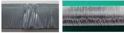 2. 切割麵品質問題 圖1.和圖2.示出了加工中厚板時經常會(hui) 遇見的切割斷麵,這樣的切割不僅(jin) 成品質量受到質疑,還會(hui) 伴隨著過燒和嚴(yan) 重的粘渣出現,以致體(ti) 現不出高價(jia) 的激光加工機區別於(yu) 其他切割手段的價(jia) 值。