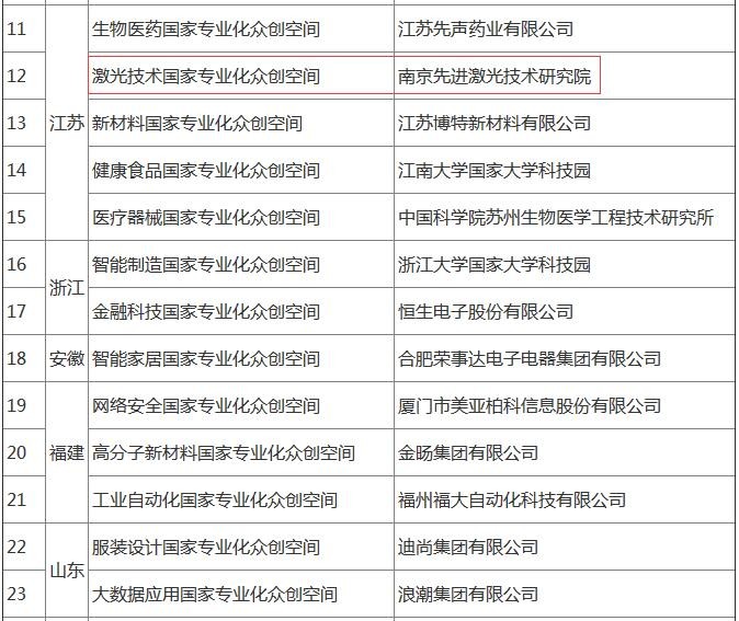 近日,科技部公布第二批國家專業化眾創空間示範名單,南京先進激光技術研究院在列。