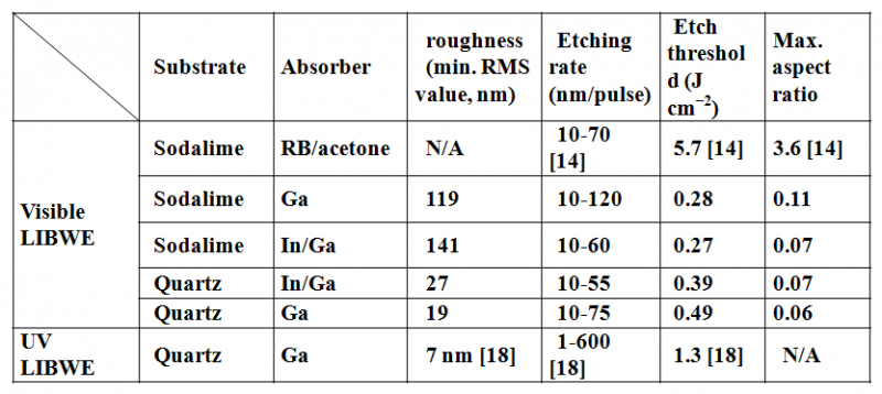 表1. UV-LIBWE與(yu) Visible LIBWE的蝕刻結果比較表[10]