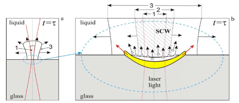 利用單一脈衝(chong) 波模式來解釋LIBWE蝕刻過程的機製;在a和b中,紅色曲線表示聚焦在玻璃/液體(ti) 界麵上的激光束; 1表示觀察到90%激光能量的區域; 2為(wei) 激光脈衝(chong) 末端高溫超臨(lin) 界水(SCW)的擴展麵積; 3是高液壓的擴大區域。帶箭頭的空白圓圈表示超臨(lin) 界水高溫蒸發和玻璃蝕刻的過程;黃色的區域表示軟化的玻璃的體(ti) 積,其通過高液壓沿著邊緣被擠出。[21]