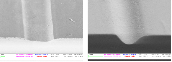 LIBWE係統的雷射光源大多是探用紫外光雷射光源,其波長包含248 nm、266nm及355nm…等多種不同波長,而其相對應吸收染劑也相對多,例如甲苯或芘(pyrene)/丙酮和金屬吸收染料(例如銀)…等多種,其蝕刻結果如下圖所示,可刻出接近光學平麵之流道,其最佳表現粗糙度(Ra)可達10 nm以下 [8]. 此外,高深寬比之微結構蝕刻是LIBWE之特點,如下圖5所示,其深寛比可高達60,因此可用於(yu) 做深溝之結構。