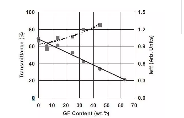 對於(yu) 填充型聚合物材料來說,光學性能受到填充材料的影響較大。以玻纖為(wei) 例,Val Kagan研究了不同玻纖含量的PA6增強樹脂的透過率(圖3),發現隨著玻纖含量的增加,材料的透過率是線性下降的。