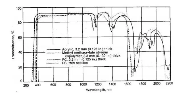 根據上文所述,聚合物在近紅外區具有較高的透過率,因此在選擇上靈活性較大。在車燈上,作為(wei) 透過層的配光鏡常選擇可見光區透光率也比較高的PC或PMMA。