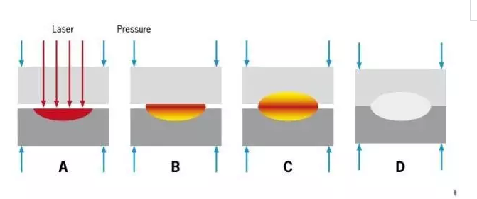 激光焊接是利用高能量密度的激光束作為(wei) 熱源的一種焊接方法,即激光輻射加熱工件表麵,表麵熱量通過熱傳(chuan) 導向內(nei) 部擴散,使工件熔化,形成特定的熔池。因此,激光光束的能量必須被塑料吸收,才能達到良好焊接效果(如圖1所示)。