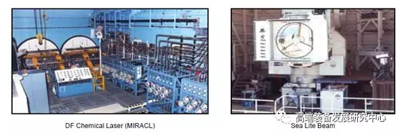20世紀80年代中期開發的中紅外高級化學激光器(MIRACL)是美國研發化學激光器的重點項目。 MIRACL產(chan) 生的是連續波,中紅外(3.8-μ)激光,其操作類似於(yu) 燃料(乙烯,C2H4)用氧化劑(三氟化氮,NF3)燃燒的火箭發動機。光束可以被引導到許多不同的測試區域或SEA LITE光束導向器進行測試。