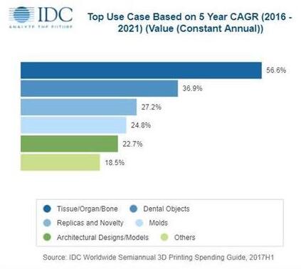 3D打印的主要用例是原型、售後部件以及新產品的部件。作為離散型製造業的主要使用案例,2018年這三個用例將占全球開支的44%。到2021年,牙科用品和醫療支持對象將成為第四大和第五大用例,主要由醫療保健提供商行業。兩項用於支出增長最快的組合/器官/骨骼(56.6%複合年增長率)和牙科用品(36.9%複合年增長率)的用例也將由醫療保健提供商支出推動。