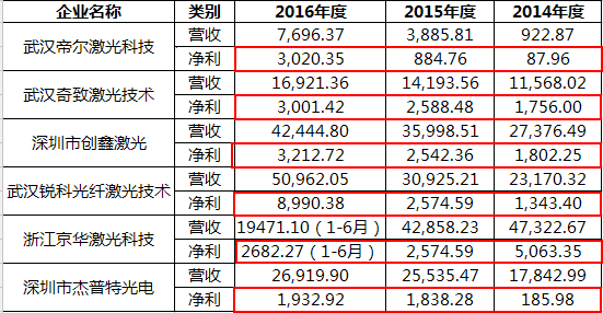 另外,前瞻君還進一步整理正常IPO排隊6家激光類企業(ye) ,報告期內(nei) 主要營收和淨利,從(cong) 下麵6家正常排隊激光類企業(ye) ,2014-2016年的營收淨利看出,這3年激光類企業(ye) 的業(ye) 績還是增長很迅速。