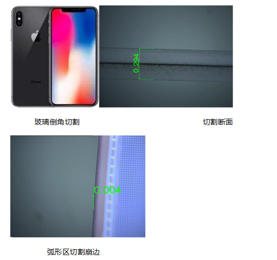 Amber係列高功率皮秒激光器應用於(yu) 目前火爆期的全麵屏手機麵板玻璃,配合恰當的切割工藝,能夠有效的減小崩邊,提高玻璃強度。