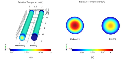 圖2.Cr,Er,Pr:GYSGG和鍵合GYSGG/Cr,Er,Pr:GYSGG激光棒的熱分布。(a)晶體(ti) 棒表麵的熱分布;(b)鍵合麵位置的熱分布。