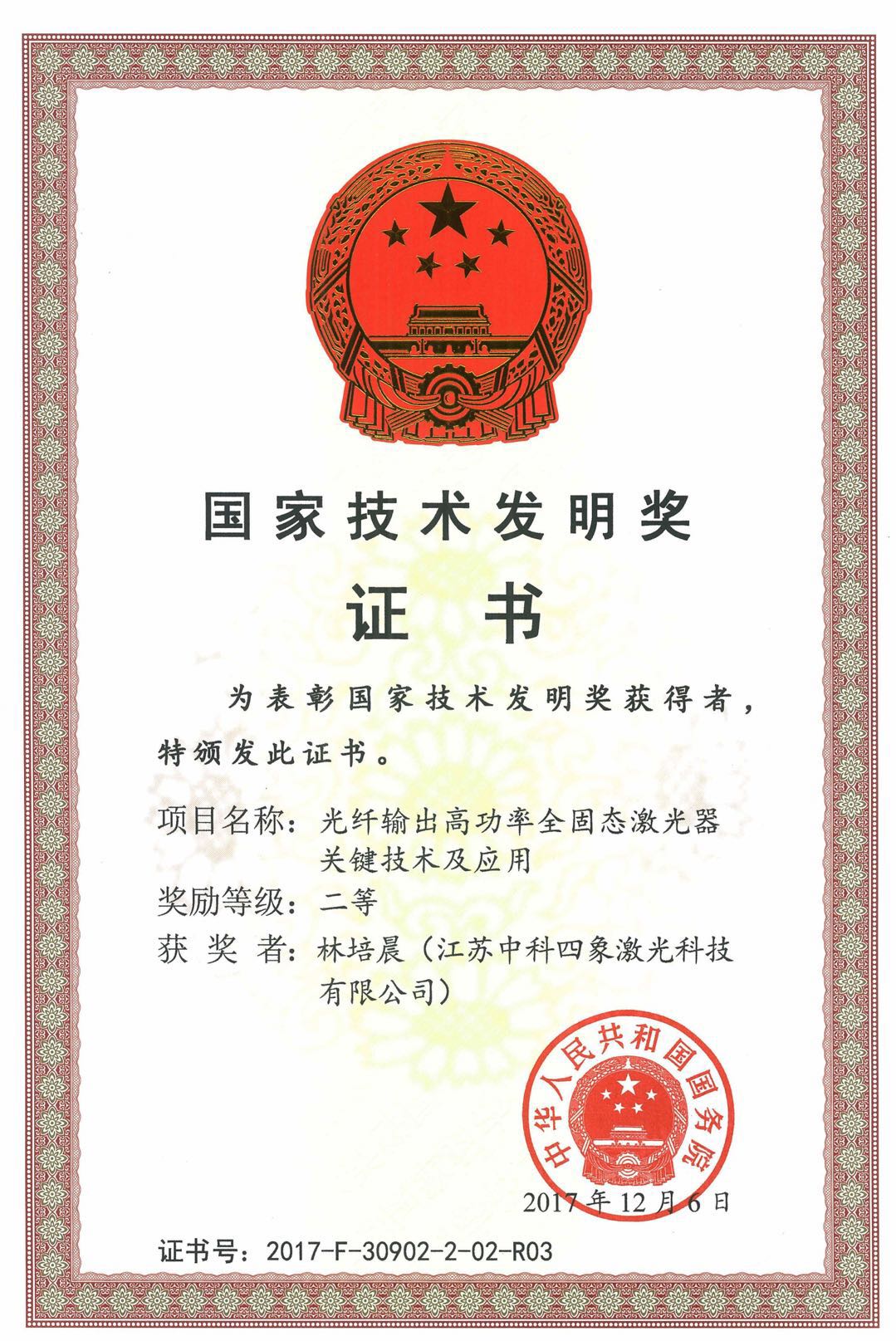 國家技術發明獎證書(shu)