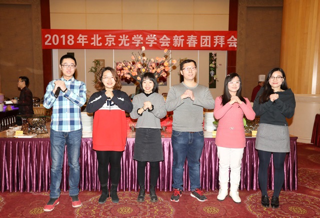 圖12、北京光學學會(hui) 高校研究生分會(hui) 的代表向與(yu) 會(hui) 嘉賓拜年!左起:北京信息科技大學分會(hui) 主席曲道明、北京郵電大學分會(hui) 副主席李璿、北京交通大學分會(hui) 主席程丹、北京工業(ye) 大學分會(hui) 主席宋舒傑、北京大學分會(hui) 副主席邵陳荻、北京理工大學分會(hui) 主席江海燕。