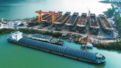 圖為重慶市雲陽縣青龍街道健民村三壩溪船舶建造基地的航拍照片,7艘主體基本完成的新船矗立在庫岸邊。