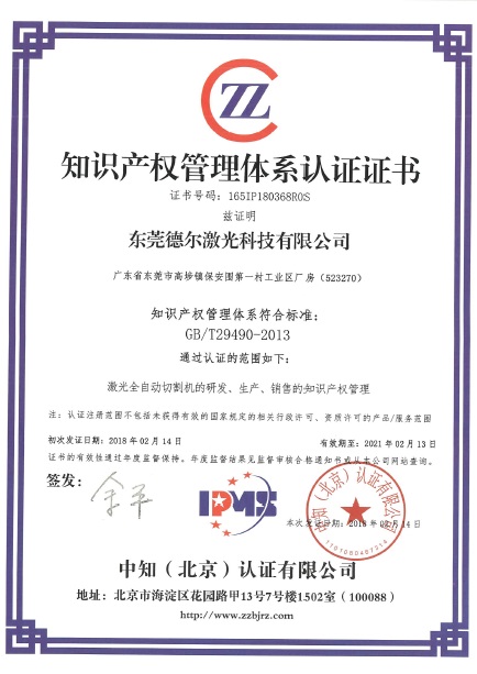 近日獲悉,東(dong) 莞德爾激光科技有限公司知識產(chan) 權管理體(ti) 係符合GB/T29490-2013標準,其公司的激光全自動切割機的研發、生產(chan) 、銷售的知