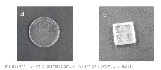 筆者所在的課題組在國內(nei) 較早開展了激光3D打印玻璃的研究和探索。通過分散機將平均粒徑為(wei) 50 nm的氣相SiO2粉體(ti) 分散在甲基丙烯酸羥乙酯(光敏單體(ti) )、四乙二醇二丙烯酸酯(交聯劑)和安息香二甲醚(光引發劑)的混合溶劑中,形成流動性良好的液態玻璃漿料,將玻璃漿料置於(yu) 模具中用紫外燈照射使其固化,驗證了該漿料用於(yu) 光固化立體(ti) 成形的可行性。接著以該玻璃漿料為(wei) 原料,利用光固化快速成型機,在激光功率70 mW,掃描速率2000 mm/s打印出塊狀坯體(ti) ,通過後續熱處理排脂,最終在1250 ℃得到透明玻璃塊體(ti) ,見下圖2。