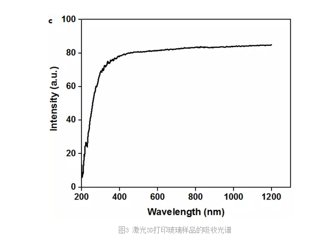 由測得的樣品的吸收光譜可見,最終所得玻璃樣品在可見光範圍內有吸收,證明了其良好的透光性,如圖3所示。