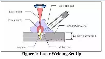 當功率密度達到一定的範圍(106~107 W/cm2)的激光束照射到材料表麵時,材料吸收光能轉化為(wei) 熱能,材料被加熱熔化至汽化,產(chan) 生大量的金屬蒸汽,在蒸汽逸出表麵時產(chan) 生的反作用力下,使熔化的金屬液體(ti) 向四周排擠,形成凹坑,隨著激光的繼續照射,凹坑穿入更深,當激光停止照射後,凹坑周邊的熔液回流,冷卻凝固後將兩(liang) 工件焊接在一起。