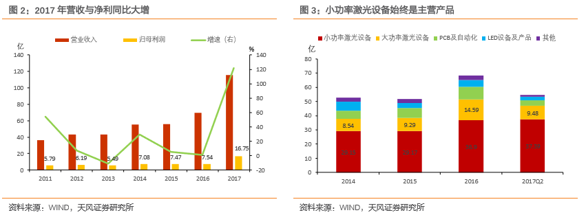 經過多年擴張,公司已從(cong) 初期單一的小功率激光打標產(chan) 品發展到目前以大小功率激光設備、PCB 及自動化配套設備為(wei) 主的幾大生產(chan) 線。根據2017年業(ye) 績快報,公司實現營業(ye) 收入115.6億(yi) ,其中歸母淨利16.75億(yi) ,較上年同比大幅增長122%。