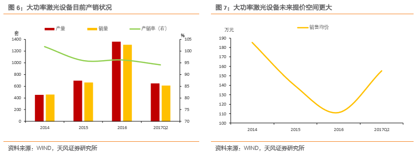大功率設備有望成為(wei) 未來邊際利潤的主要增長來源。在與(yu) 小功率激光設備發展對比之下,大功率的增長預期還未被打滿。我們(men) 主要基於(yu) 以下兩(liang) 方麵的考量:第一,小功率市場已經充分競爭(zheng) ,大功率市場由於(yu) 技術、生產(chan) 規模以及資金壁壘的存在,相對稀缺性使得未來提價(jia) 空間更大,而這部分又是公司的戰略發展重點,具備一定的潛力。第二,向先進製造業(ye) 轉型升級的大趨勢不可逆,而這又會(hui) 催生將裝備向更高層次更新換代的訴求。就公司自身而言,已經成為(wei) 了中航工業(ye) 、中國船舶(24.670, 0.00, 0.00%)重工、東(dong) 風農(nong) 機等企業(ye) 的穩定供應商,在政策催化下,未來發展有想象力。