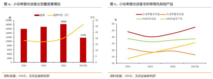 下遊需求放量,疊加核心產(chan) 品漲價(jia) 驅動業(ye) 績倍增。通過拆解公司過往收入結構,小功率激光設備始終是公司營收的主要來源。作為(wei) 吸納應用該類設備最廣泛的下遊消費類電子行業(ye) ,2017年全年景氣度向好,行業(ye) 需求旺盛,有效支撐了激光設備出貨量穩定增長,而產(chan) 品單價(jia) 上漲則進一步刺激了公司業(ye) 績。根據已有數據,公司小功率激光設備17年半年度的營收就已超16年全年,全年業(ye) 績快報數據喜人。