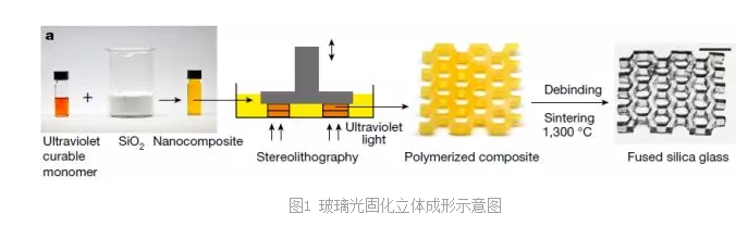 當玻璃樹脂黏度較高,流動性較差時,則可采用倒置式打印。工作台浸沒在樹脂中,紫外光按零件切片輪廓信息從下往上照射使之固化。當一層薄層固化完成之後,工作台上升一個層厚,進行新一輪固化。如此反複,直至零件打印完成。將打印出的坯件放入爐子中進行熱處理,按照設定好的溫度製度、焙燒氣氛和壓力進行熱處理。這個過程分為兩個階段:根據選用的有機物加熱到特定溫度脫去坯體中的有機物,這是十分敏感容易出現缺陷的階段;加熱到1000 ℃以上實現致密化、形成玻璃,燒結完成等冷卻後便可得到最終的玻璃產品了。可參見下圖1。