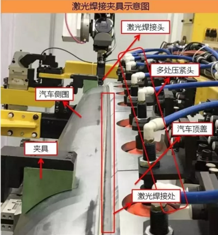 激光焊接過程中需要對焊接鋼板進行足夠穩固的夾緊,所以會(hui) 設計專(zhuan) 門的夾具。激光焊接夾具體(ti) 積龐大、結構複雜,整體(ti) 為(wei) 框式結構,左右車身兩(liang) 側(ce) 用夾具型塊頂住、定位支撐好以後用汽缸夾緊。上部設計專(zhuan) 門的汽車頂蓋激光釺焊的定位壓緊抓具,使用多個(ge) 壓緊頭進行壓緊,用機器人抓住頂蓋,擺放在車身上,用汽缸夾緊,讓車身鋼板需要焊接的邊沿貼合足夠緊密。