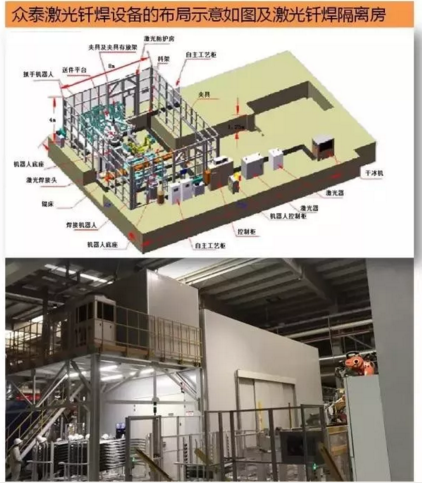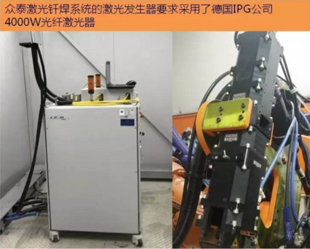 作為(wei) 大批量工業(ye) 生產(chan) 激光釺焊設備的激光發生器,需要滿足設備可靠、工藝穩定、模塊設計靈活方便的特點。目前眾(zhong) 泰汽車激光釺焊選用的是國際知名品牌的激光焊設備,修建封閉的特殊隔離房,進行安全防護,裝置除塵係統,使用淨化水進行循環冷卻,使用光纖快速接頭進行切換維護。激光焊設備之間進行網絡通訊,及時有效的進行工藝調整。