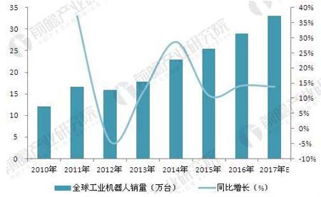 圖表3:2010-2017年全球工業機器人銷量變化情況及其預測(單位:萬台,%)