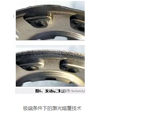 隨著激光熔覆技術的成熟與(yu) 發展,陸續成功的應用於(yu) 瓦楞輥的激光熔覆見圖4,缸套火焰環的激光熔覆直接製造見圖5,發動機部件修複見圖6等。實現了以激光為(wei) 主要加工手段對各種金屬部件的幾何缺失,按照原製造標準進行幾何尺寸的回複、性能的提升。隨著科學技術和工程技術的發展與(yu) 需要,金屬部件工作的條件愈來愈苛刻,經常工作在高交變應力、高溫、高速、高腐蝕等極端條件下。因此,製造金屬部件的材料需要同時具有多種性能才能滿足零件特殊的服役條件。而且這些部件的製造成本、製造周期長,一旦失效產(chan) 生巨大的經濟損失和安全事故。如輪機裝備中,各類重要的部件如:葉片、轉子軸頸、閥杆、葉輪、閥門等;飛機發動機、內(nei) 燃機部件等。這些工程上的技術難題,為(wei) 激光熔覆技術提出了新的挑戰。因此,如何解決(jue) 極端條件下失效零部件的修複問題是十分迫切和複雜的,需要對極端條件下,零部件的失效形式分析,剩餘(yu) 壽命進行評估,選擇合適的材料、工藝方法。因此,以極端條件下關(guan) 鍵零部件的強化與(yu) 修複為(wei) 切入點,係統研究激光熔覆強化與(yu) 再製造技術,通過若幹關(guan) 鍵技術的聯合攻關(guan) ,獲得適合於(yu) 極端條件下,各種零部件強化與(yu) 修複的總體(ti) 技術。重點需要攻關(guan) 的方向: