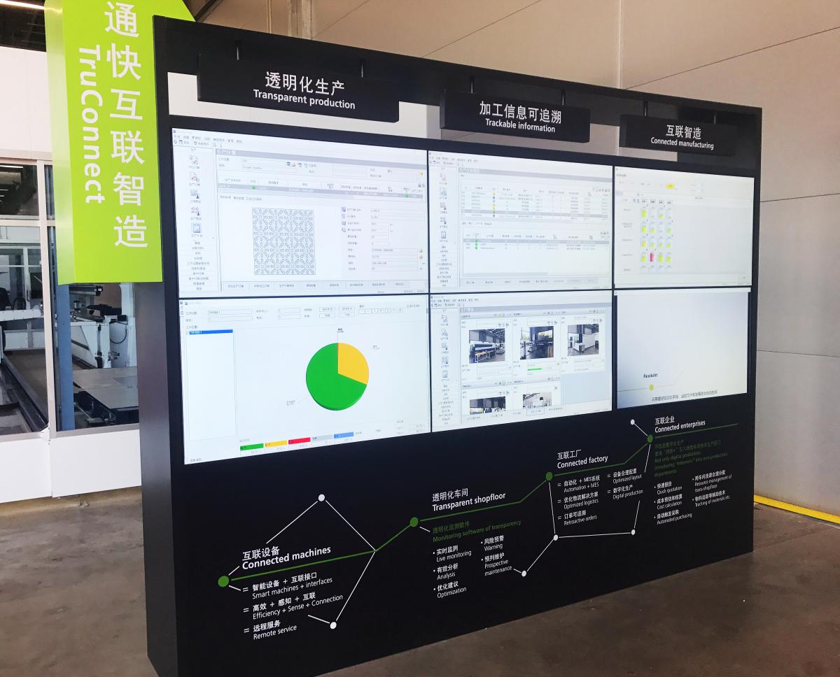 進入展廳,赫然映入眼簾的便是通快互聯智造(TruConnect)的顯示屏,也勾勒出此次技術博覽會的核心內容。同時,在展示廳入口處,數字化的信息牆也是此次互聯智造展示的一部分。結合眾多的展示產品和技術,賓客們在現場切身體驗和感受到了數字化和透明化生產的卓越優勢。