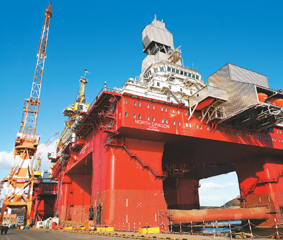 圖為中集來福士海洋工程有限公司為國外公司生產的石油鑽井平台在碼頭上組裝測試。
