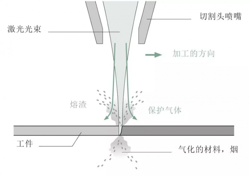 圖1 激光束熔化工件,切割氣吹走切口中的熔融材料和熔渣