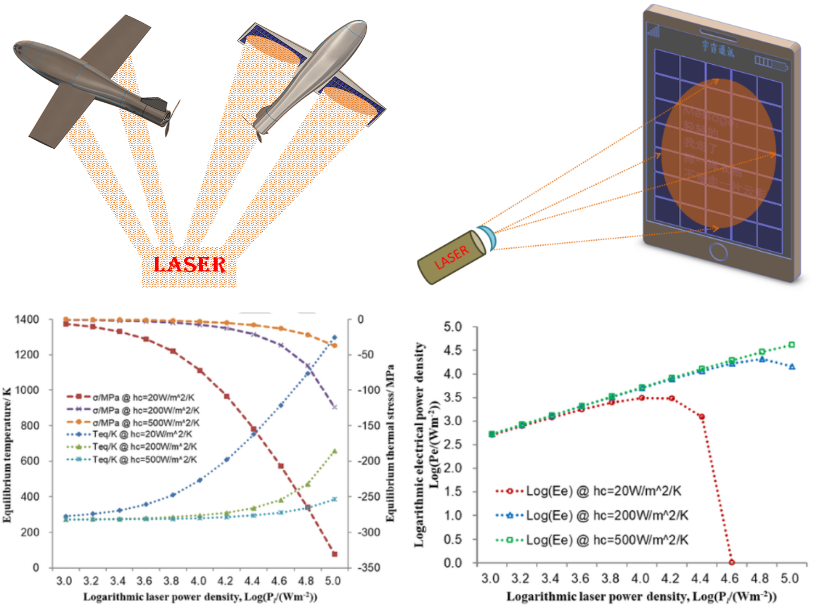 圖(上) 激光充能技術概念;(下) 激光輻照光電池的力、熱、電效應耦合算例