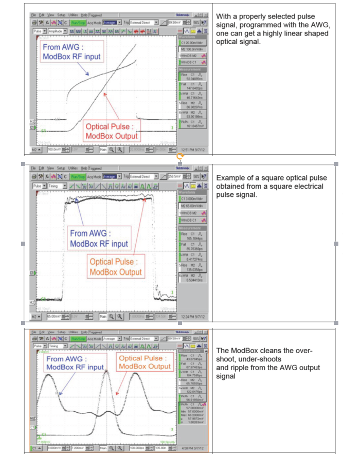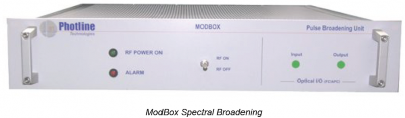 铌酸鋰電光調製器(LiNbO3 Modulator)被證明是實現光信號的暫時性整形與光譜展寬的理想器件。法國Photline公司開發除了專門的一體化ModBox調製方案已實現以上功能。