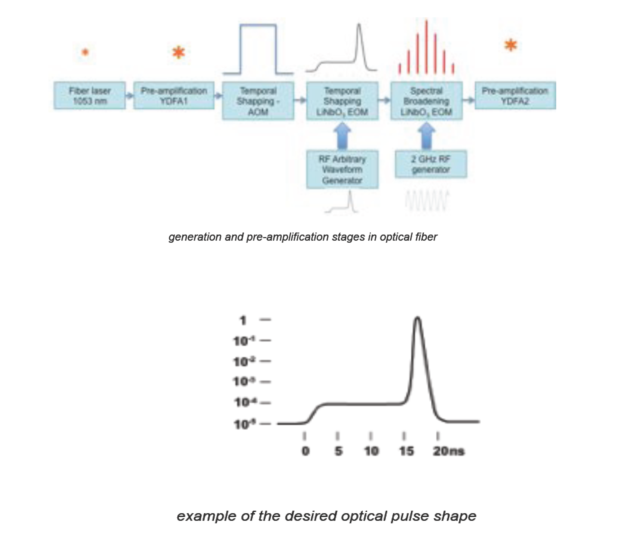 上述所有的高能量激光器都是基於MOPA結構(Master Oscillator Power Amplifier)。在這種結構的激光器中,初始的種子激光承擔了產生所需要形狀脈衝的主要功能。既然由種子光產生的脈衝在放大過程中將會變形,那麽具有對初始脈衝進行預整形的能力就尤為重要了。