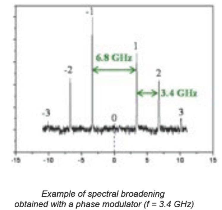 超高強度激光器中的各個不同放大級所得到的光功率密度已經遠遠足夠產生受激布裏淵散射,而受激布裏淵散射對於放大鏈中的光學器件會產生嚴重損傷或毀壞。為了削弱布裏淵散射的影響,有必要通過產生多個邊帶的方法將信號光譜展寬。運用被高功率射頻發生器驅動的铌酸鋰電光相位調製器可以得到這些邊帶。