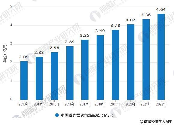 全球激光雷達市場,北美占據整個(ge) 市場收入的45%左右,歐洲占據33%市場份額。據前瞻產(chan) 業(ye) 研究院發布的《激光雷達行業(ye) 市場前瞻與(yu) 投資戰略規劃分析報告》數據顯示,隨著我國經濟發展,激光雷達應用領域增加,我國激光雷達市場規模將會(hui) 大幅度增長。2013年fun88官网平台雷達市場規模隻有2.09億(yi) 元,到2016年fun88官网平台雷達市場規模達到了2.89億(yi) 元,同比增長11.8%。到了2017年,fun88官网平台雷達市場規模達3.25億(yi) 元。預計2018年fun88官网平台雷達市場規模將達3.49億(yi) 元,2022年將達到4.64億(yi) 元。
