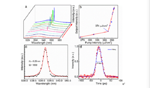 圖2 雙光子泵浦頻率上轉換立方體(ti) 微腔激射。a)單模激光。b)激射閾值。c)光譜寬度。d)輸出時域脈衝(chong) 。