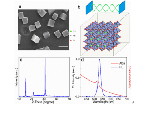 圖1 立方體(ti) 鈣鈦礦光學性能表征。a)TEM形貌圖。b)晶體(ti) 結構及微腔示意圖。c) XRD譜圖。d)吸收譜和熒光譜。