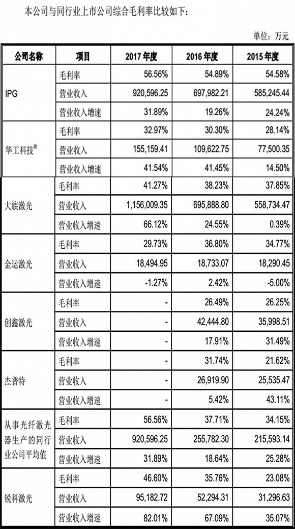 銳科激光招股說明書稱,公司已成長為全球光纖激光器行業有影響力的企業,並與全球最大的光纖激光製造商IPG等國外知名企業直接競爭。