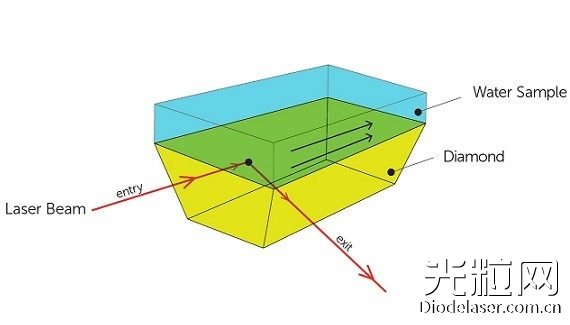紅外光束被送入水流過的鑽石中。 然後,IR光在與水樣接觸的內表麵上反射,然後由檢測器在離開晶體時收集。
